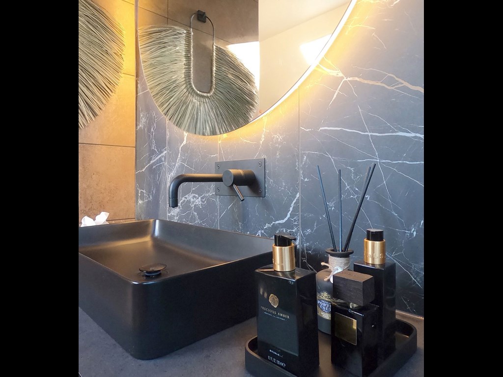Blant produktene hun valgte var både matt sort toalett, innebygget matt sort servantbatteri og sort dusj. Og detaljene er ikke overlatt til tilfeldighetene, det ble til og med sort toalettpapir!